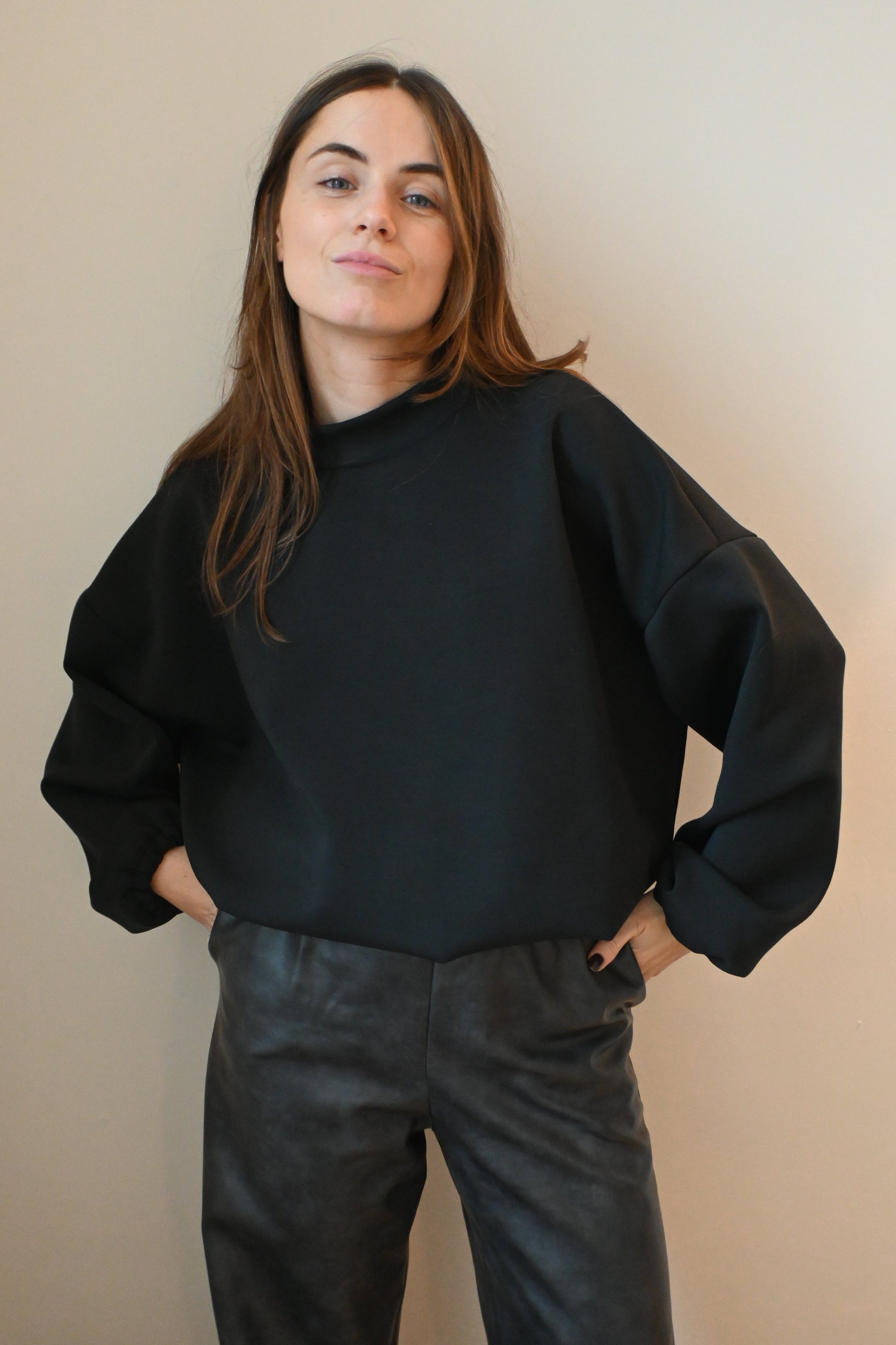 Deze trui heeft een hoog vallende ronde hals en gepofte mouwen. In de mouwen is elastiek verwerkt voor een speels effect. Ook in de middel is een elastische rand toegevoegd, waardoor je zelf kunt spelen met de lengte van de trui en deze naar wens kunt stylen.