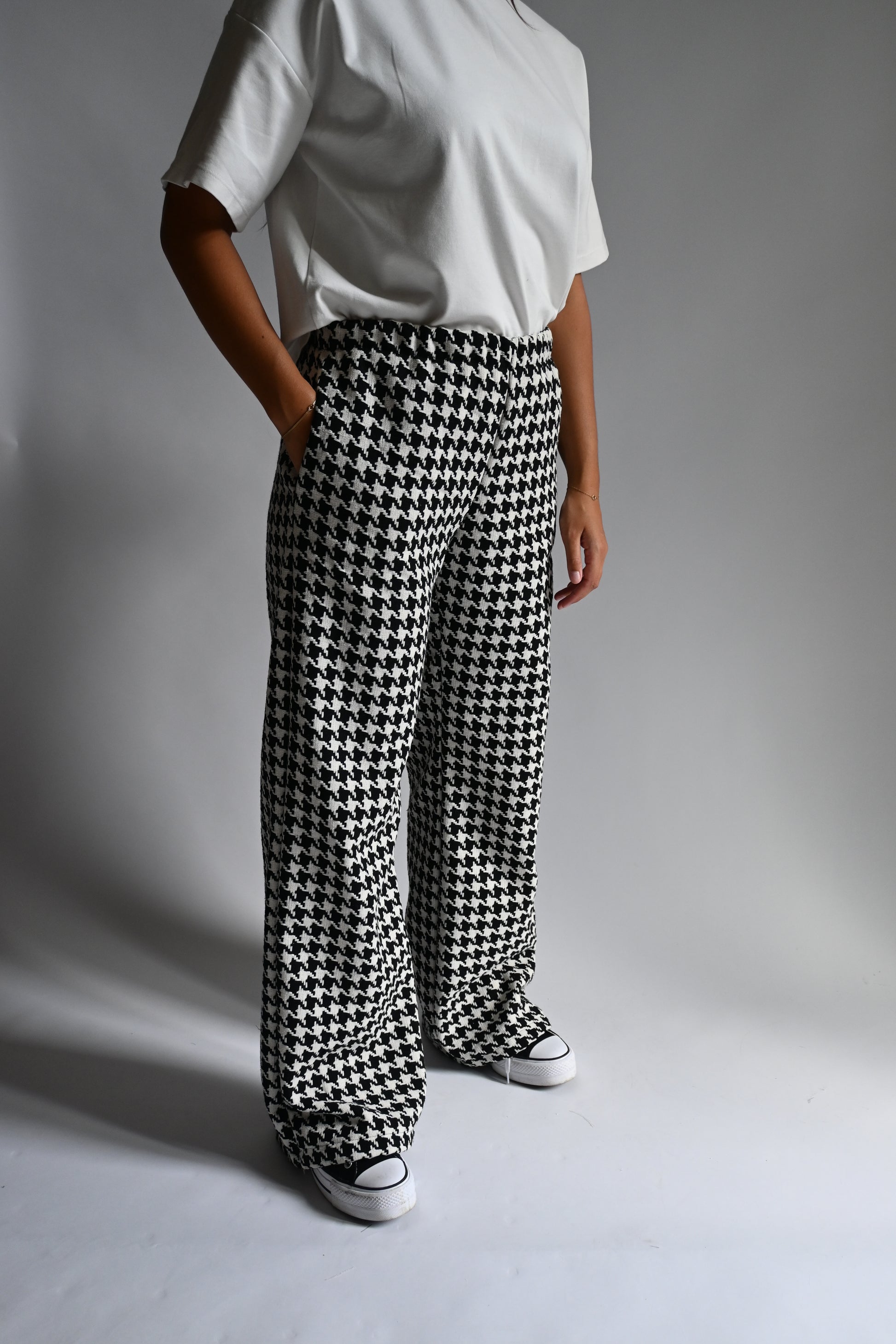 De broek heeft zakken en een wijd uitlopende pijp. In de tailleband is elastiek verwerkt, de broek heeft een relaxte fit.