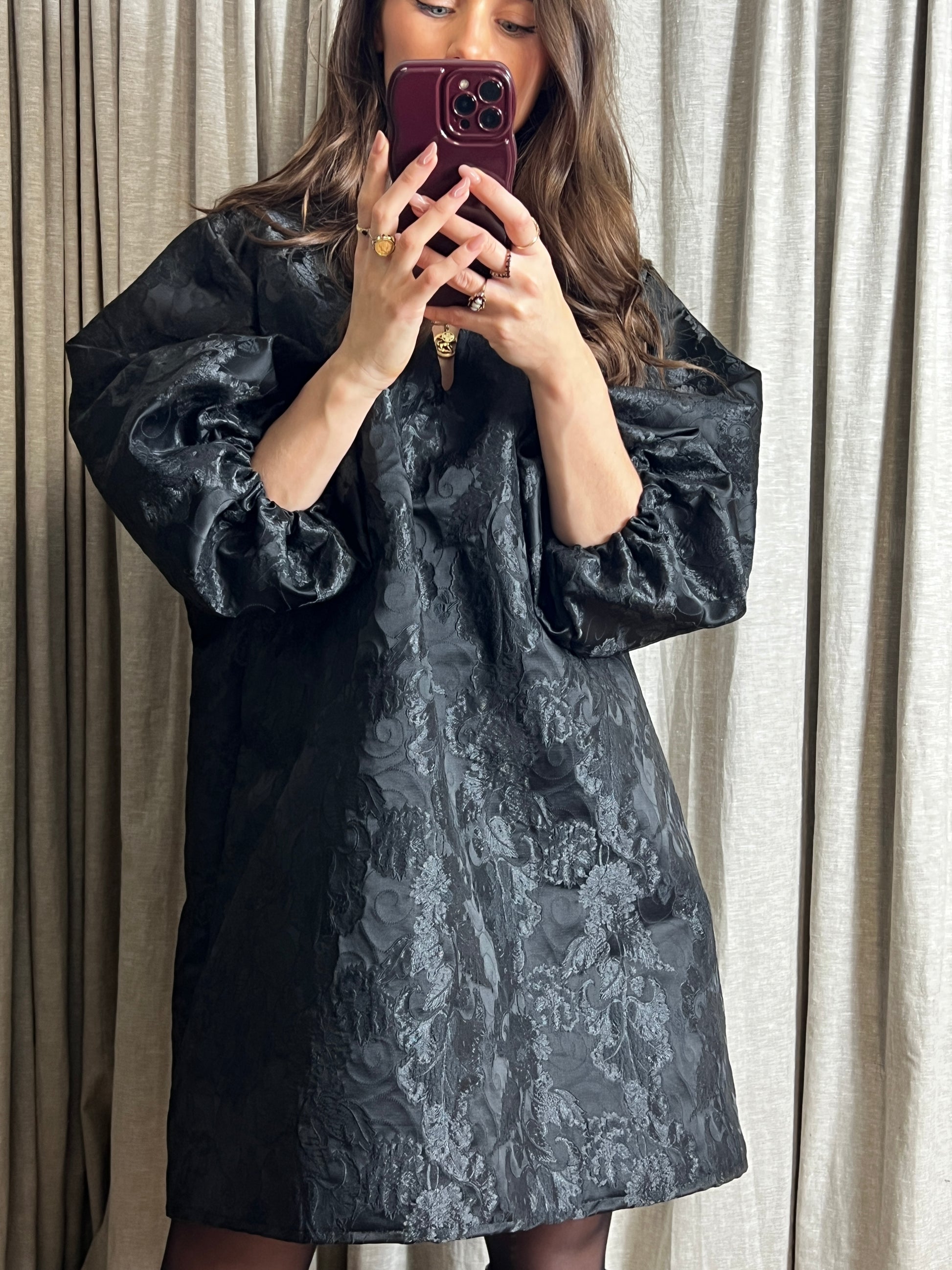 De jurk heeft een oversized fit en een elegante V-hals. In de mouwen is elastiek verwerkt voor een stijlvol gepofte effect, wat zorgt voor een speelse en moderne uitstraling.