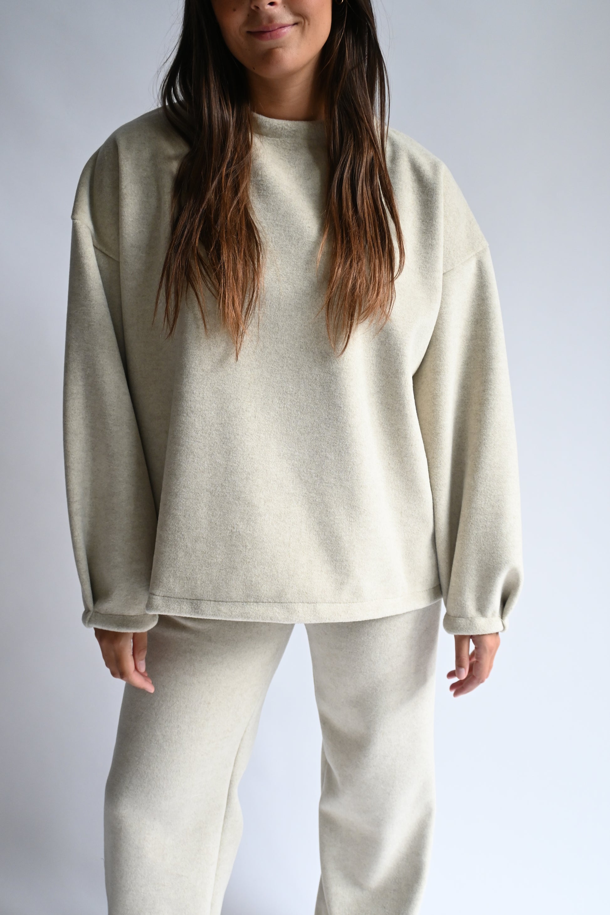 De trui heeft een ronde boothals, in de mouwen zijn plooien verwerkt voor een gepoft effect. Perfect match met de Sofie trouser.