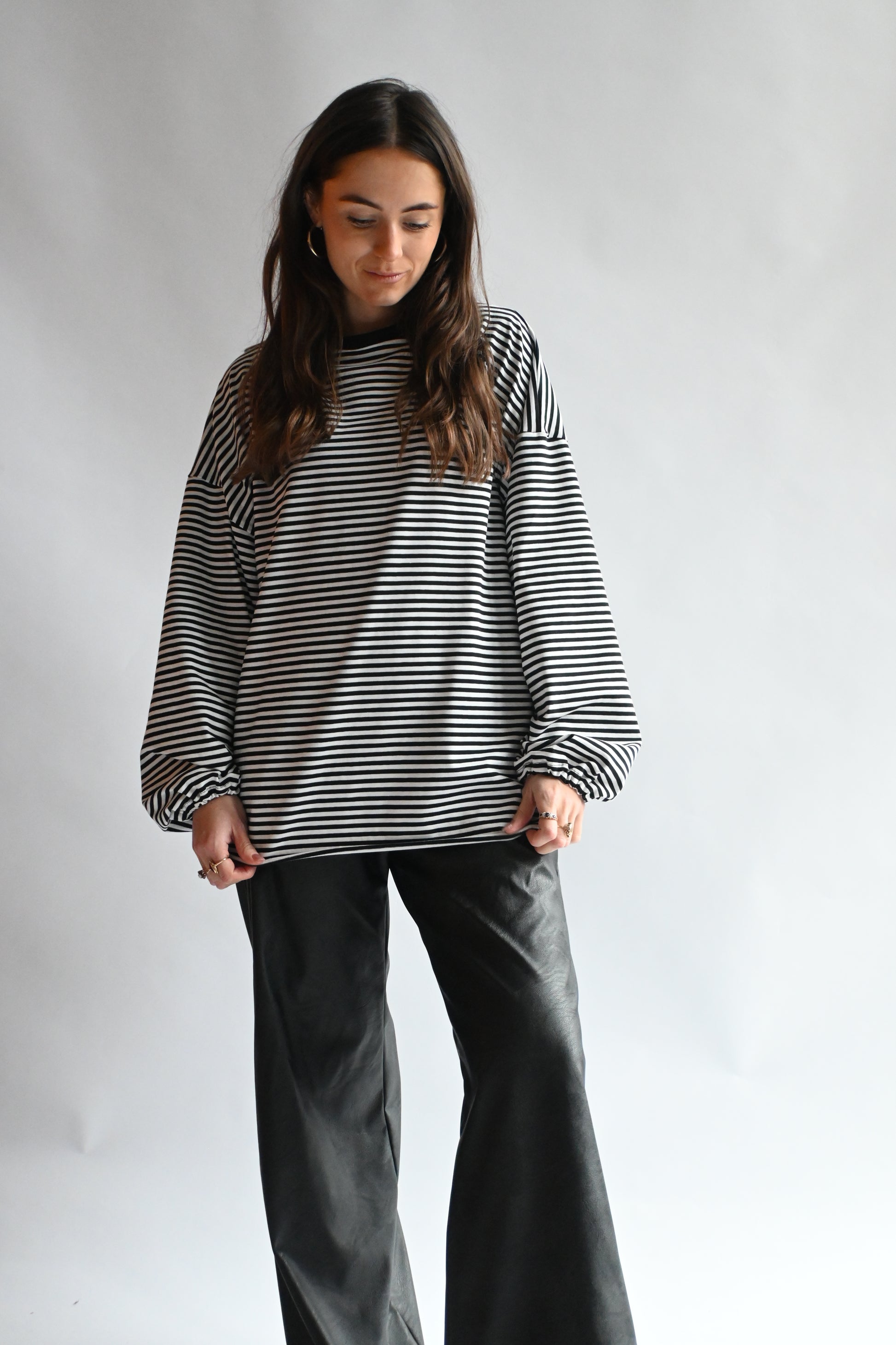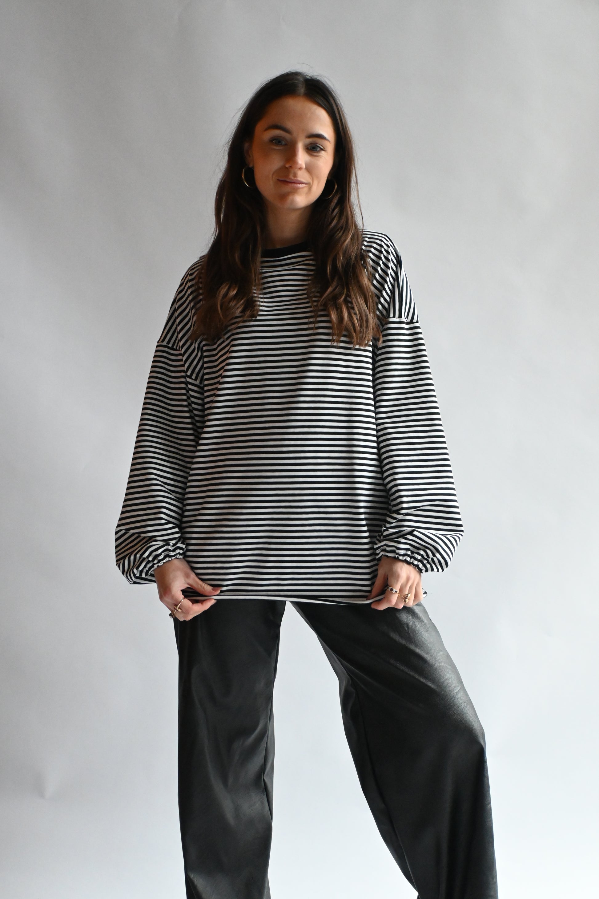 Deze trui heeft een hoog vallende ronde hals en gepofte mouwen. In de mouwen is elastiek verwerkt voor een speels effect. Ook in de middel is een elastische rand toegevoegd, waardoor je zelf kunt spelen met de lengte van de trui en deze naar wens kunt stylen.